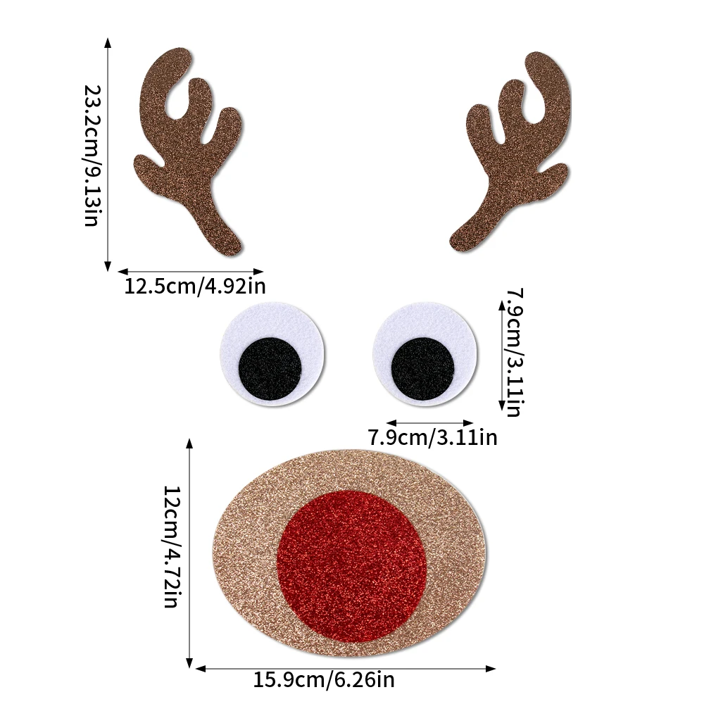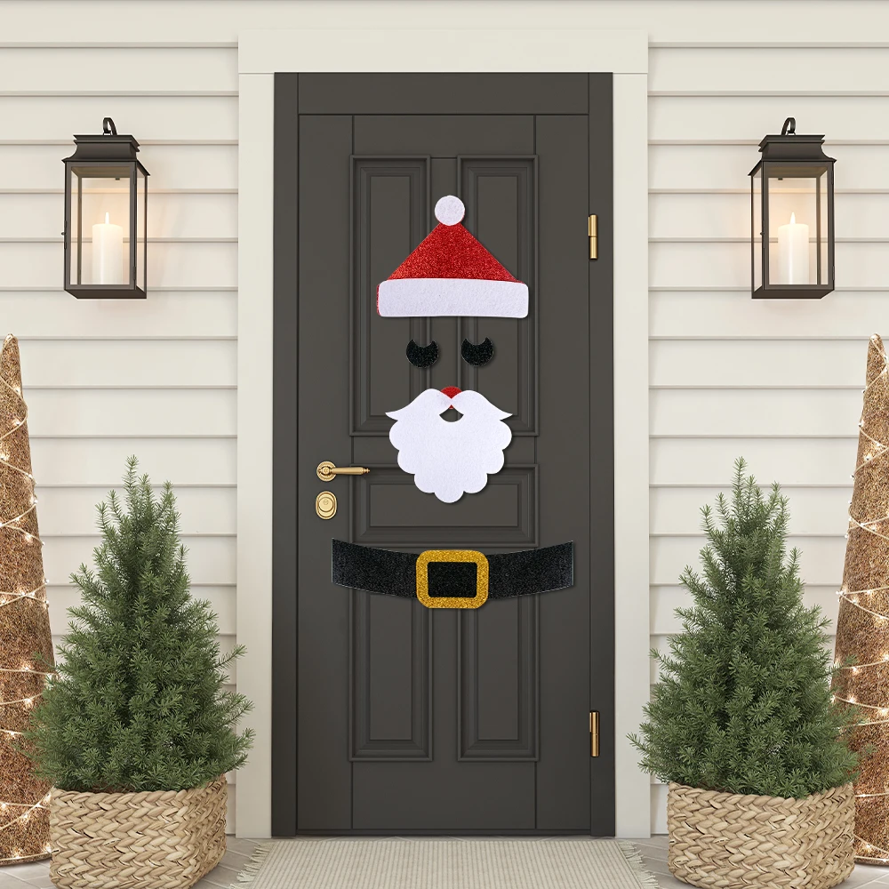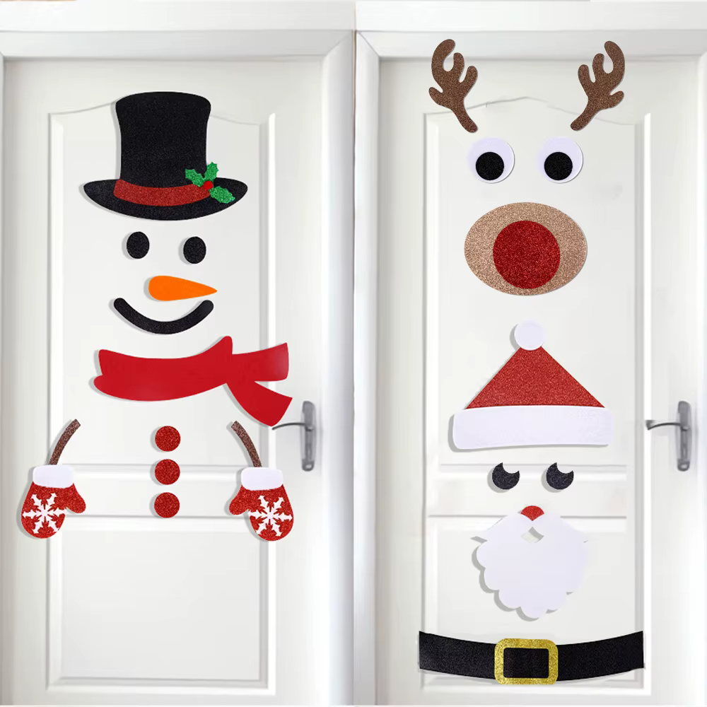 Christmas felt decorations for doors and windows, cartoon snowmen, Santa Claus, and reindeer.